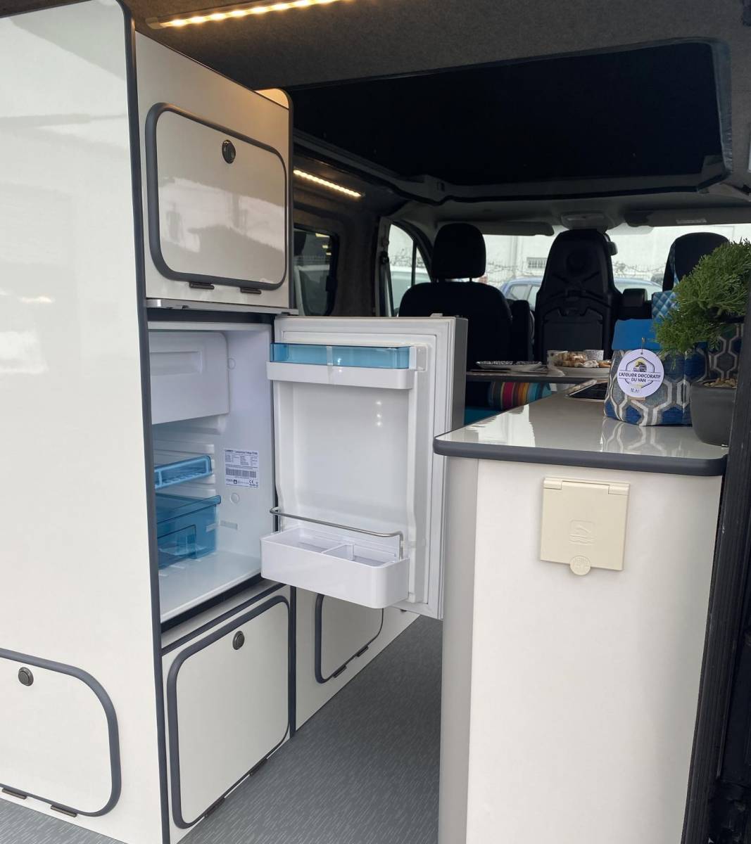 La penderie accueille un frigo à compression de 49L avec un compartiment freezer. Elle permet aussi le rangement d’un réchaud portatif qui a l’avantage de permettre de cuisiner dedans comme dehors !