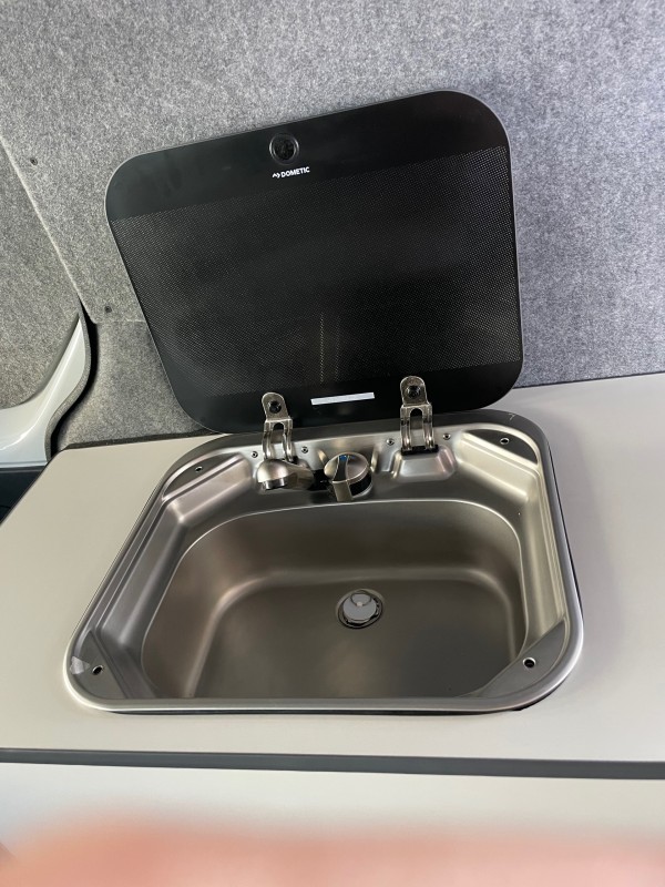 Une cuisine équipée d’un coin d’eau avec réservoirs eau propre et eau usée et un réchaud pour cuisiner.