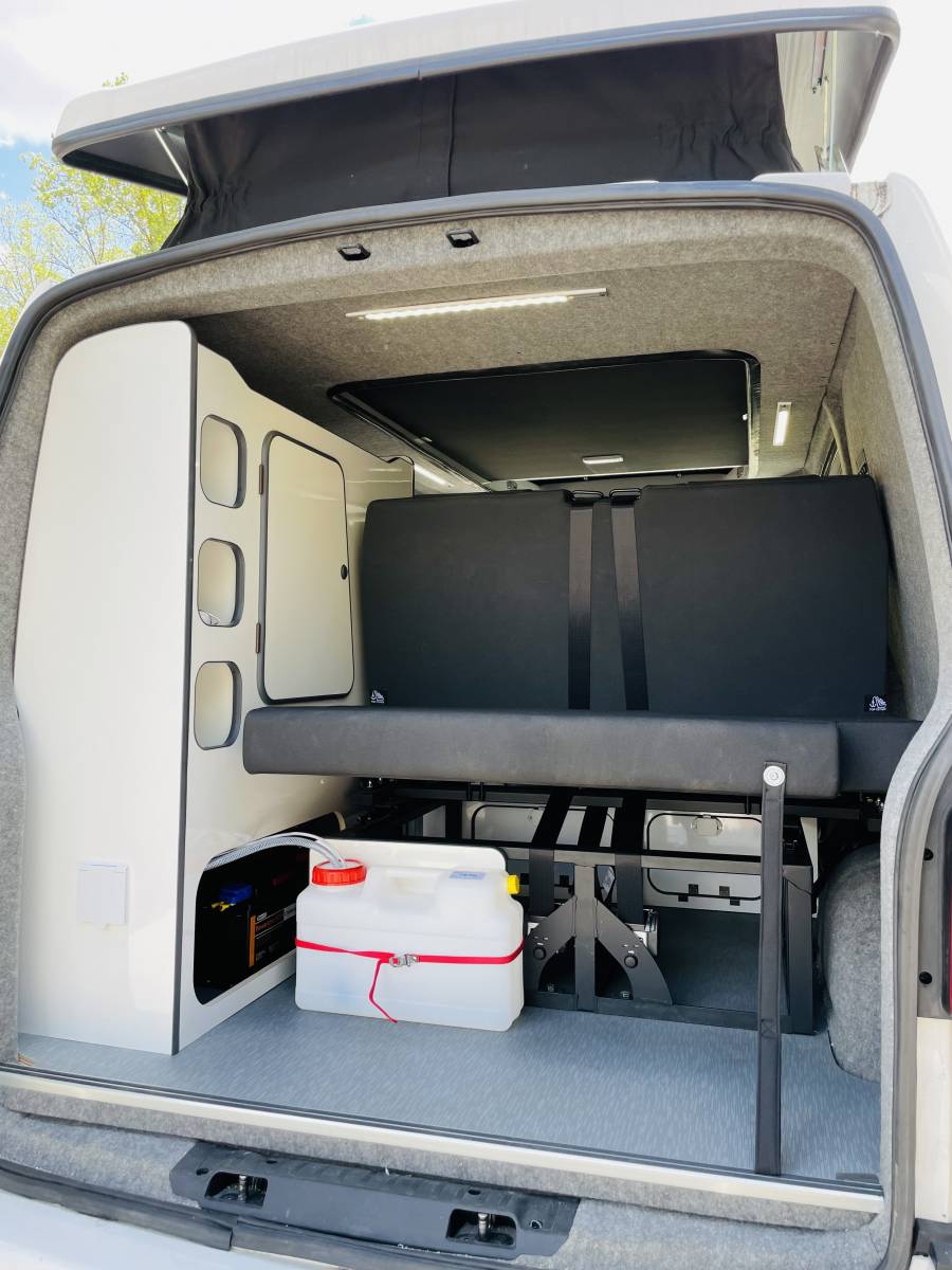 Ce pack liberty family à était entièrement réalisé dans nos ateliers sur un Volkswagen T6 pour répondre à la demande d'une famille ou de personnes étant 4 à voyager.