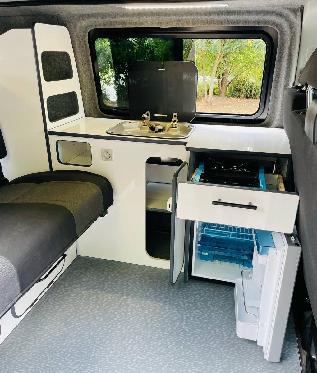 Un frigo à compression, un réchaud au gaz portatif et un evier pour votre plus grand confort.