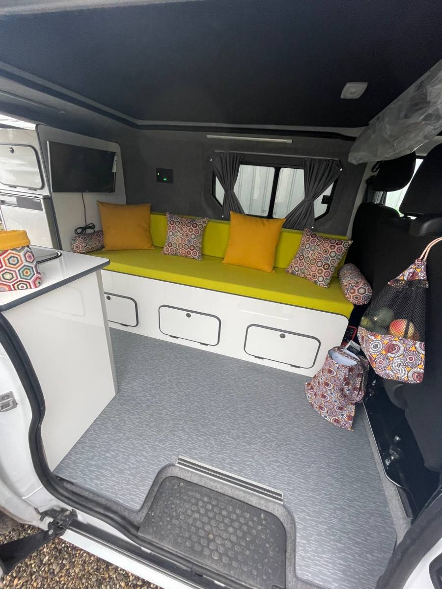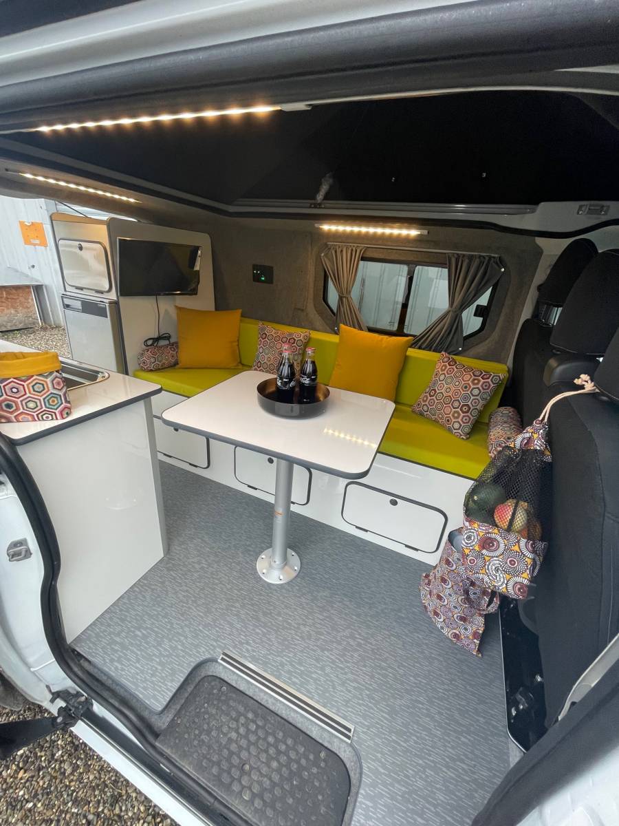 Le client a opté pour notre pack Liberty Travel, qui offre à la fois fonctionnalité et confort. Le toit relevable permet de gagner de l'espace au niveau du salon et offre un deuxième couchage très confortable, idéal pour les voyages en famille ou entre amis.