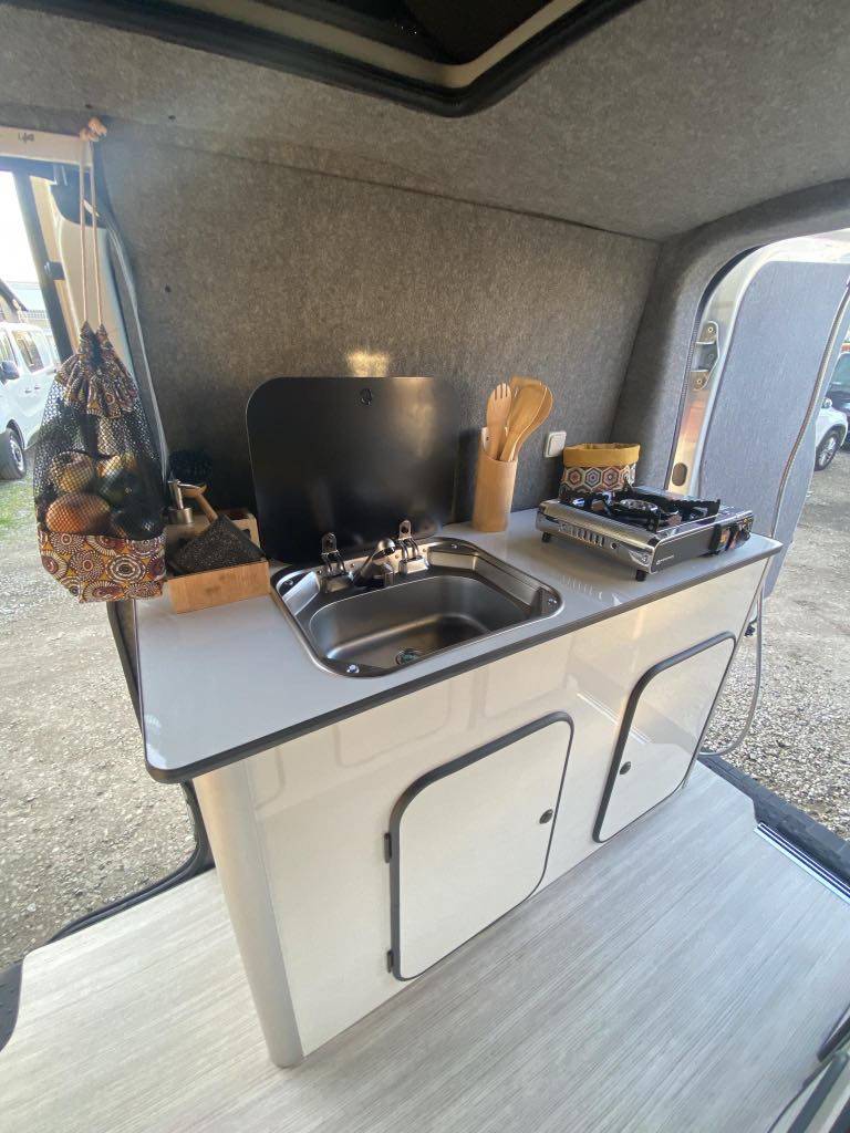 Équipé de 2 jerricans de 20L, un robinet, une pompe à eau ainsi qu'un évier avec un couvercle en verre trempé pour un confort et une finition optimal, notre système d'eau et indispensable pour vos futurs roads trips !