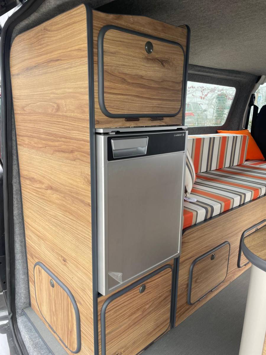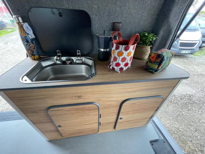 À l’intérieur, l’espace est bien pensé pour offrir confort et praticité. Le coin cuisine comprend un évier, un réchaud à gaz et un réfrigérateur, parfait pour préparer vos repas en toute simplicité, où que vous soyez. Les placards et tiroirs sont bien placés pour vous permettre de ranger vos affaires sans encombrer l’intérieur, vous offrant ainsi plus de place pour vivre.