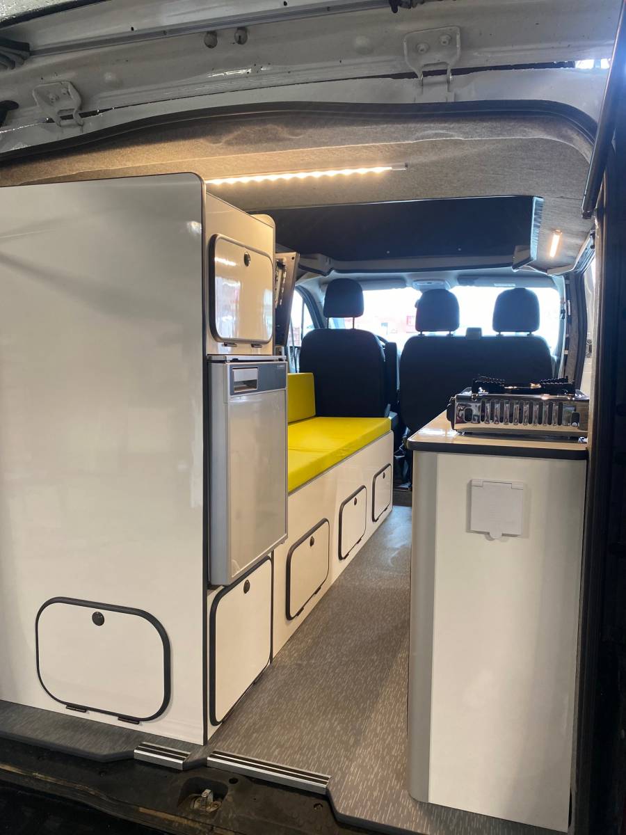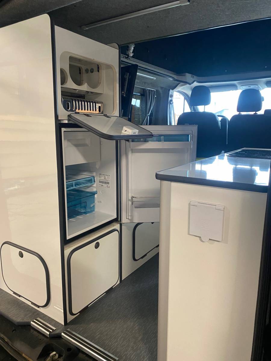 La penderie accueille un frigo à compression de 49L avec un compartiment freezer. Il permet aussi le rangement d’un réchaud portatif qui a l’avantage de permettre de cuisiner dedans comme dehors ! La partie basse du meuble offre un grand rangement permettant aussi en option d’accueillir un WC portatif.