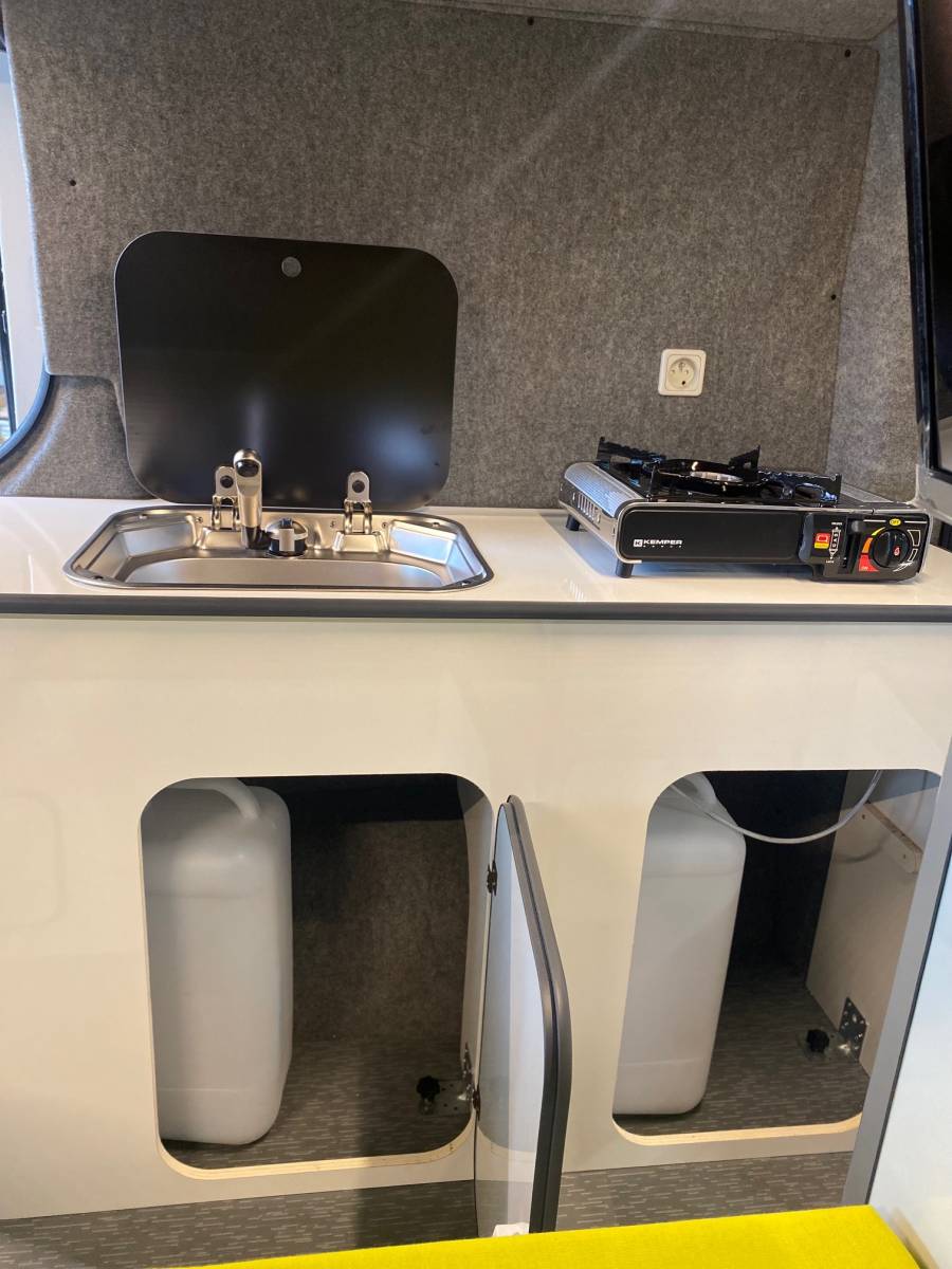 La cuisine équipée d’un coin d’eau avec réservoirs eaux propres et eaux usées, un réchaud au gaz pour cuisiner vos petit plats ainsi qu'une douchette extérieure sur l’arrière du véhicule.