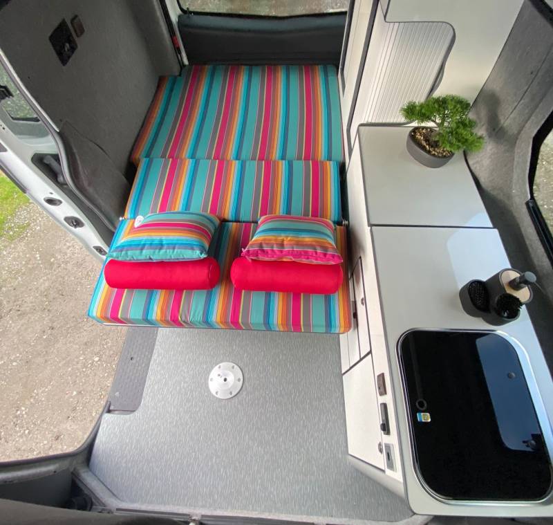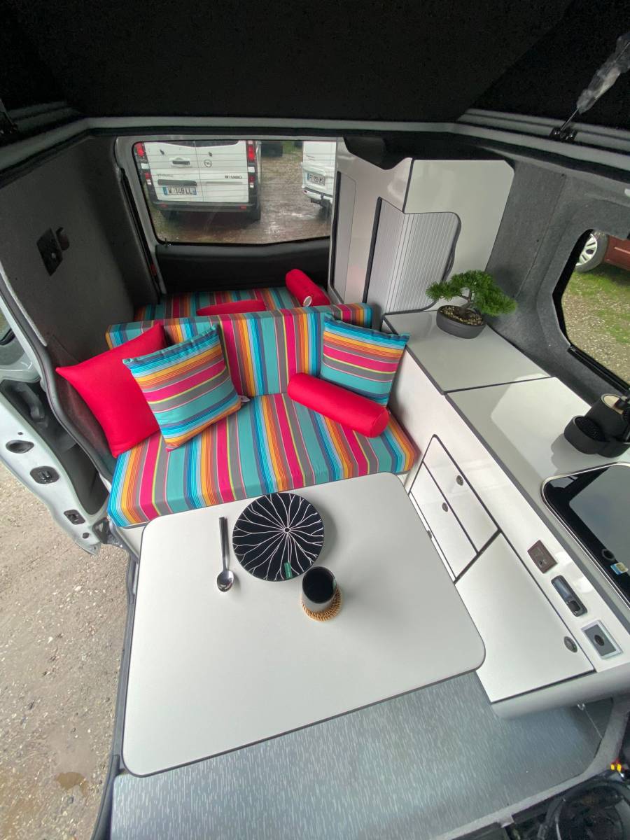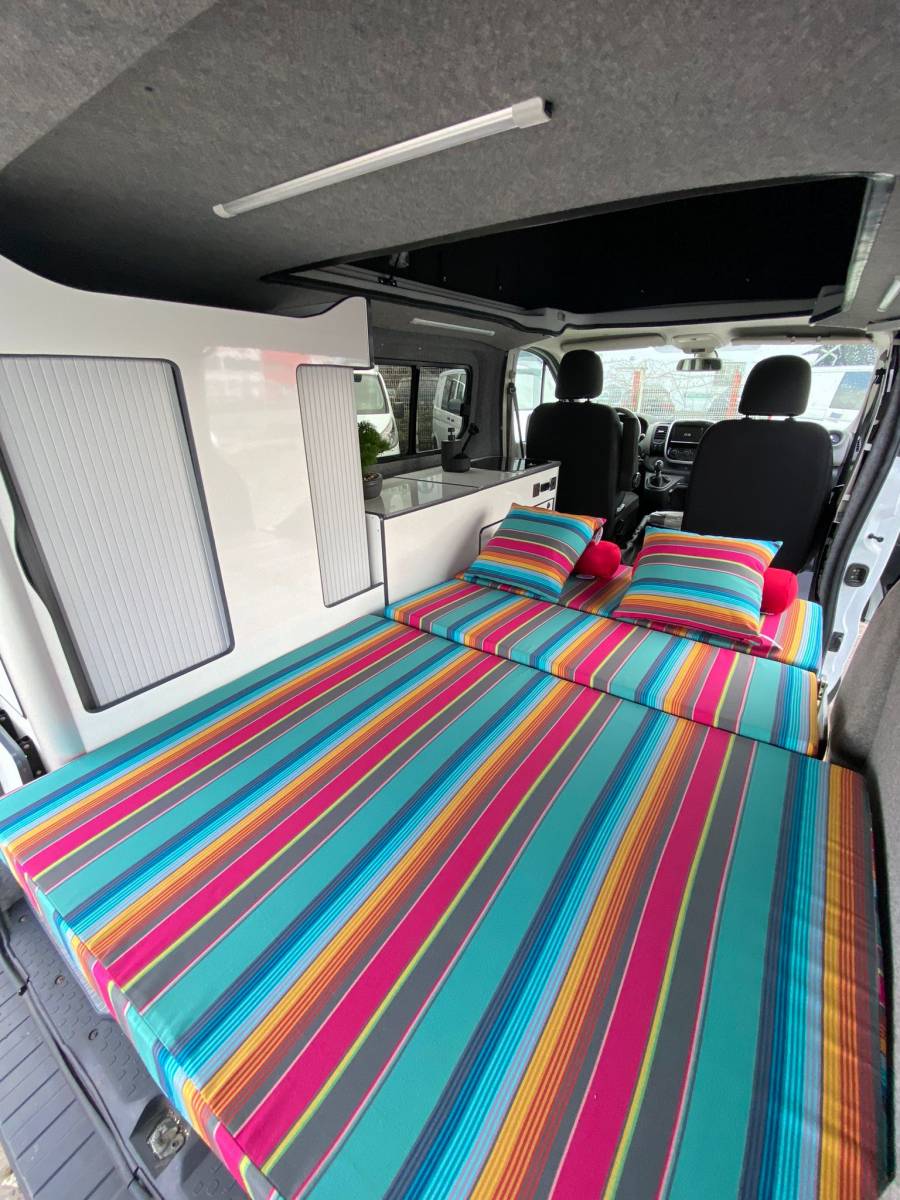 Vous bénéficiez d’un véhicule équipé de 4 couchages. 1 couchage 2 places sur la banquette qui se transforme en lit en quelques secondes ainsi que d'un second couchage 2 places dans le toit relevable avec éclairage intégré.