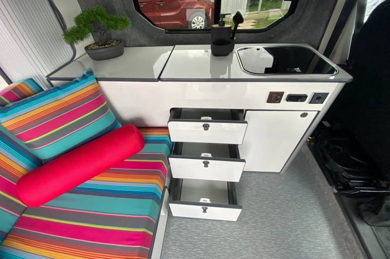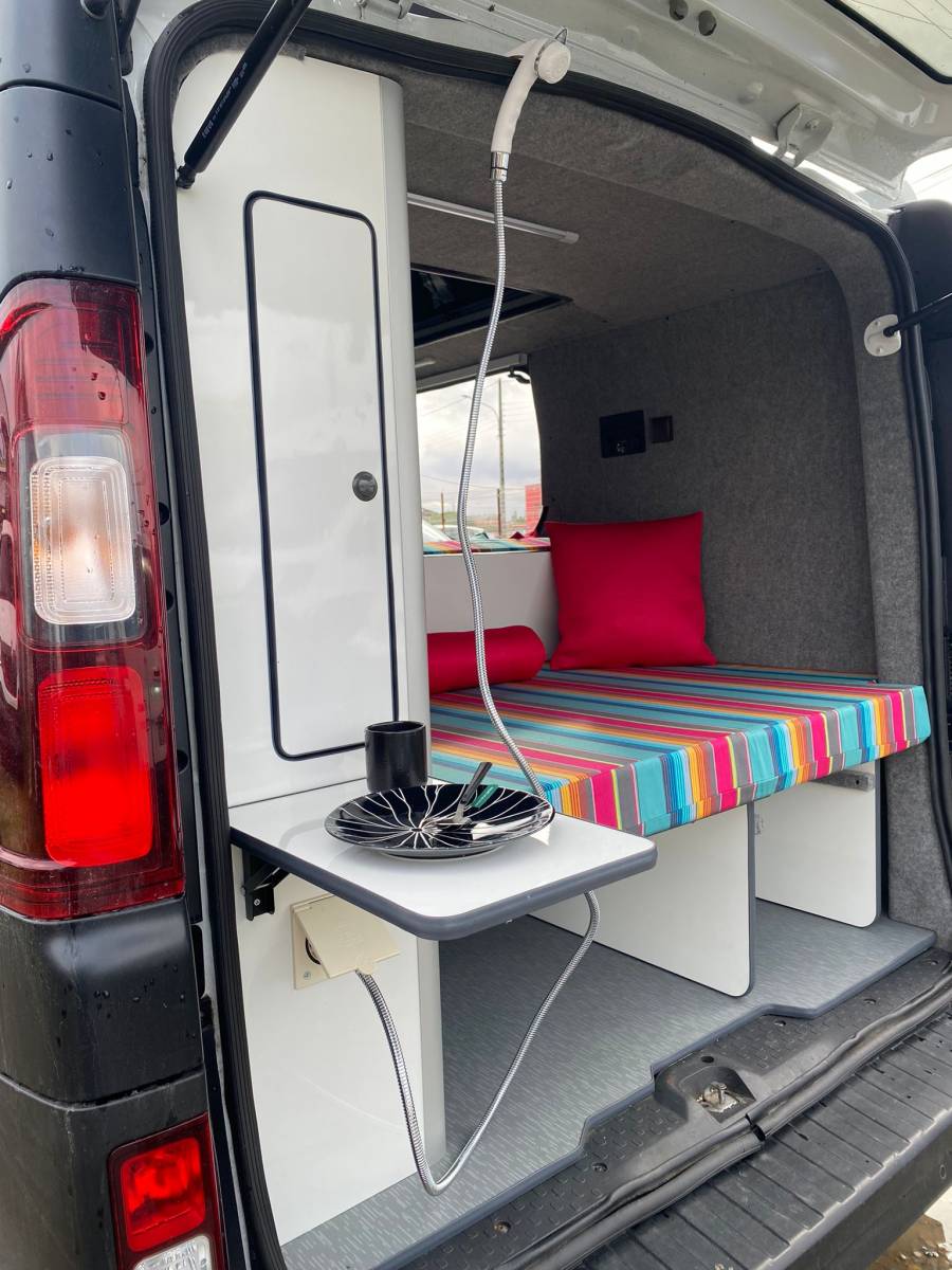 La cuisine est équipée d’un coin d’eau avec réservoirs d'eaux propres et d'eaux usées et aussi d'un réchaud portatif au gaz pour cuisiner vos petits plats dedans comme dehors. Vous pourrez y retrouver également une grande penderie avec plusieurs rangements et étagères vous permettrons de pouvoir y mettre toutes vos affaires. Et il y a éventuellement la possibilité d'y rajouter un frigo ou une glacière à compression.
