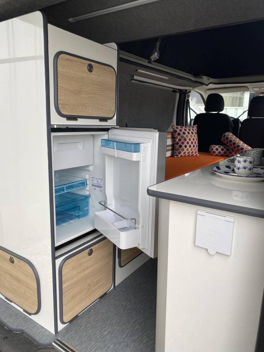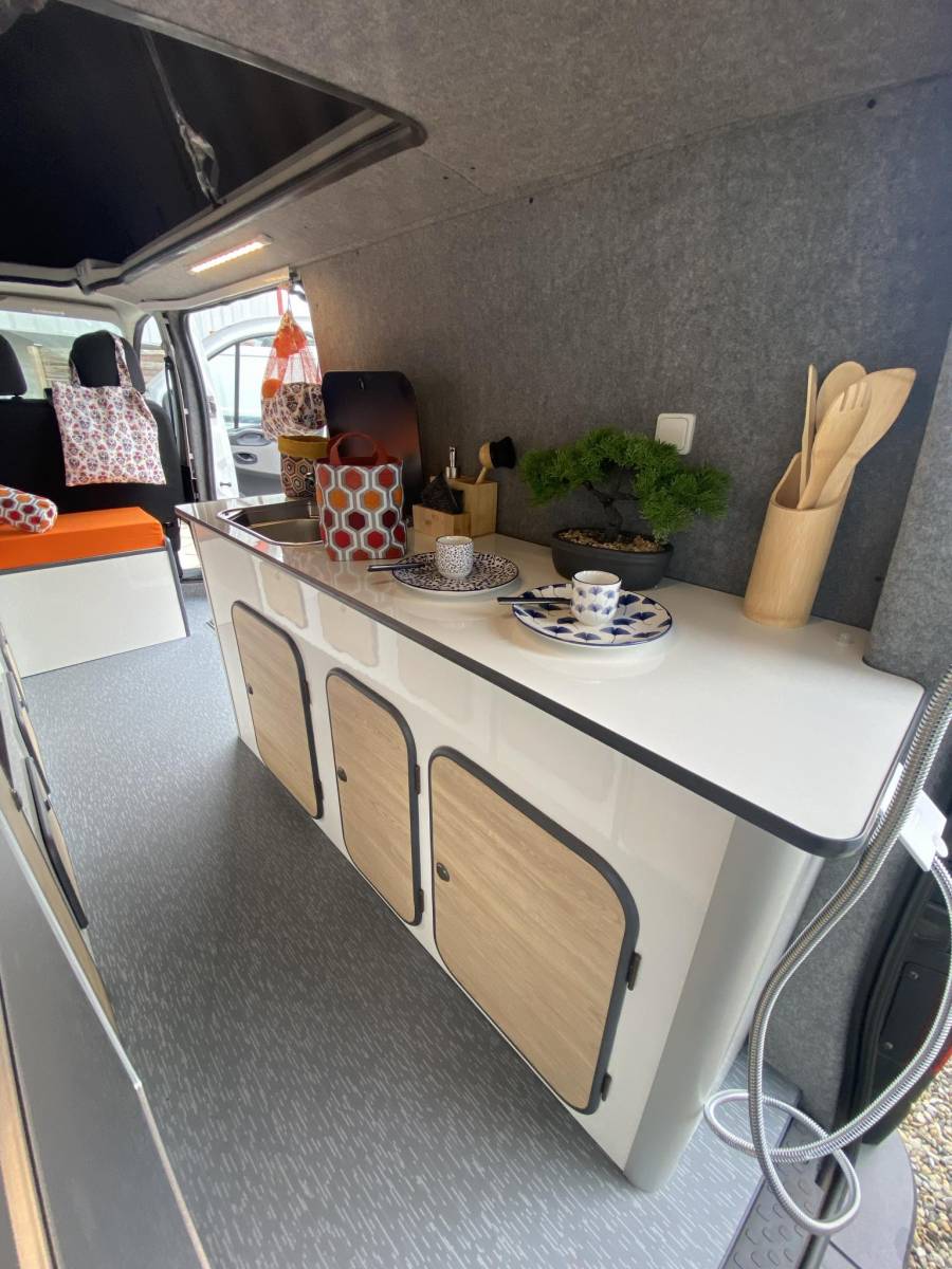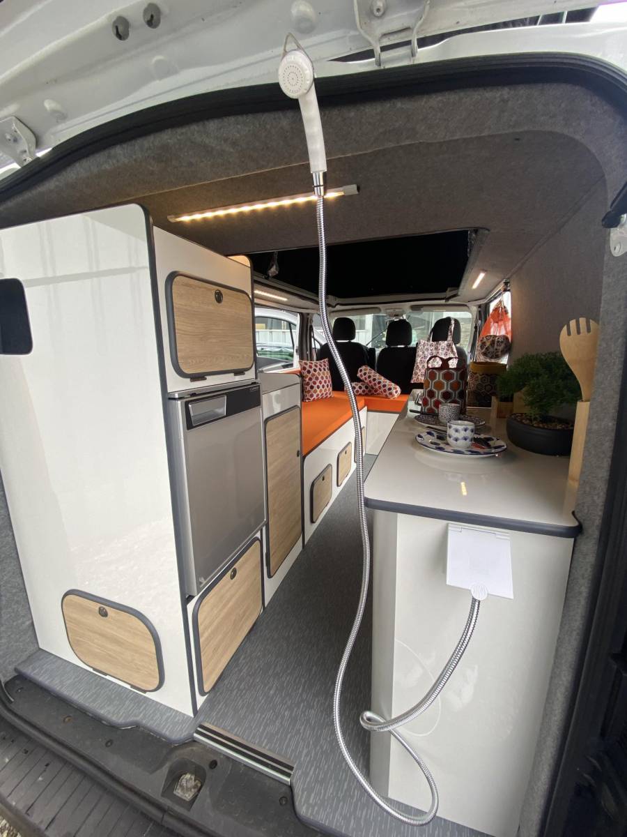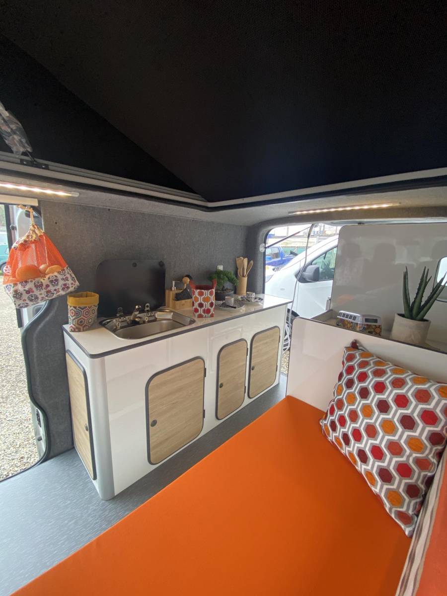 Nous y avons également installé un frigo à compression 50 l avec freezer et un évier avec vitre rabattable. Il est fourni avec 1 jerrican d'eau propre 20l et un jerrican d'eau usée 20l.