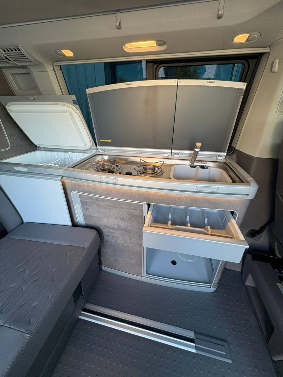 - Modèle spécial "California 6.1 Ocean Edition" - Pack aide à la conduite plus - Préparé pour "We Connect" et "We Connect Plus" - Digital Cockpit et détecteur de fatigue+ - Pack Sport extérieur y compris bas de caisse, jupe AV et AR avec plaque de soubassement en design sportif - Système de navigation "Discover Media" avec écran tactile couleur de 20.3 cm (8") - Pack double vitrage isolant acoustique dans la cabine et double vitrage teinté dans le compartiment passager - Système d'alarme volumétrique dans la cabine, Back-up Horn et protection anti soulèvement - Préparation pour dispositif d'attelage - Rétro extérieurs réglables, dégivrants et rabattables électriquement (via clé du véhicule) - App-Connect avec et sans fil - Système surveillance périmètre Front Assist avec fonction freinage d'urgence City (pour régulateur automatique de distance ACC) - Boitiers de rétroviseurs extérieur peints en noir en haut et grainés en bas, poignées de portes à la teinte du véhicule - Outillage de bord avec cric articulé - Armoire en placage "Graphite Grey" avec raccord pour douchette extérieure - Eclairage du marchepied avec monogrammes pour modèle spéciaux dans le compartiment passager - Système d'aide au stationnement à l'avant et à l'arrière - 2 Connexions USB (type C) dans le tableau de bord - 8 Haut-parleurs : 4 HP d'aigus, 4 HP de grave - Store extérieur noir - Pneus 255/45 R18 103H XL - Blocs de feux arrière à LED, teintés sombres - Boite automatique DSG - Climatisation automatique - Eclairage de jour avec allumage automatique des projecteurs, fonction Leaving Home et fonction Coming Home manuelle - Pack acoustique extra - Rallonge de lit avec matelas confort (Beach : élargissement de lit y compris 2 casiers de rangement) - Régulateur automatique de distance ACC avec "follow to stop", avec limiteur de vitesse - Système de détection de la signalisation routière - Volume de réservoir à carburant 80l - Bluetooth - Caméra de recul "Rear View" (lignes statiques) - Grille de calandre avec deux baguettes chromées - Volant cuir multifonction (3 branches) - Commande vocale - Fonctionnement intermittent des essuie-glace avec détecteur de pluie pour les essuie-glace avant - Verrouillage centralisé avec radiocommande, commande intérieure SAFELOCK - Pare brise en verre feuilleté en vitrage isolant - Jantes en alliage Springfield 18 pouces - Volant multifonctions - Sièges chauffants à l'avant - Store / Auvent extérieur - 2 chaises pliantes (dans le hayon) - Chauffage stationnaire : à air pulsé programmable, sur carburant - Couchages: lit en haut 114 x 198 cm, lit en bas 104 x 198 cm - Cuisine: 2 gaz et un évier - 1 table pliante autour de la cuisine - Inverseur 12 volts / 230 volts - Placards de rangement - Alimentation 230V pour prise intérieure et recharge des batteries auxiliaires - Frigo à compression de 37 litres - Réservoir eau propre de 30 litres - Réservoir eaux usées de 30 litres - Rideaux occultants - Siège avant pivotant - Table de camping intérieure et/ou extérieure - Toit relevable électrohydraulique - 2 batteries additionnelles - Banquette homologué 2 places transformable en lit