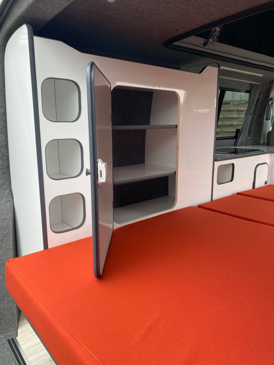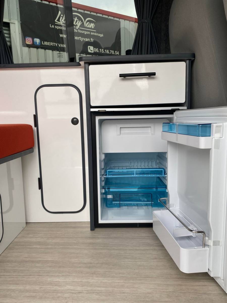 La penderie accueille un frigo à compression de 49L avec un compartiment freezer. Il permet aussi le rangement d’un réchaud portatif qui a l’avantage de permettre de cuisiner dedans comme dehors ! La partie basse du meuble offre un grand rangement permettant aussi en option d’accueillir un WC portatif.