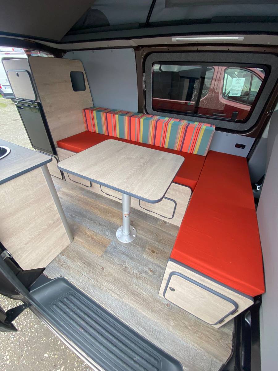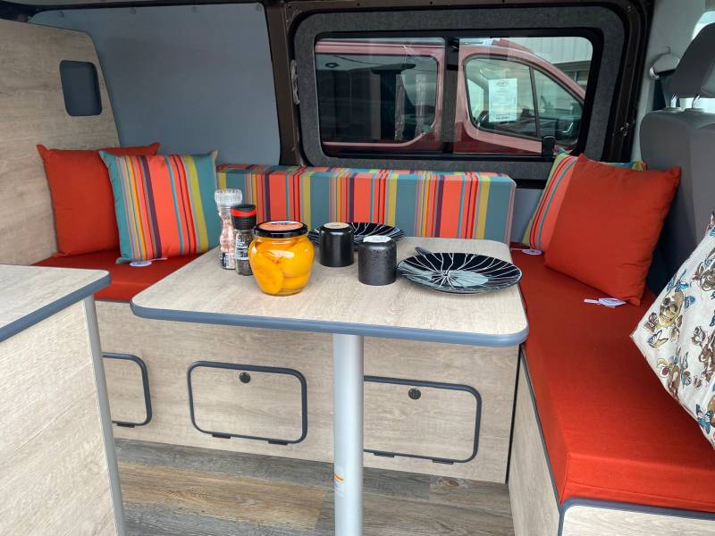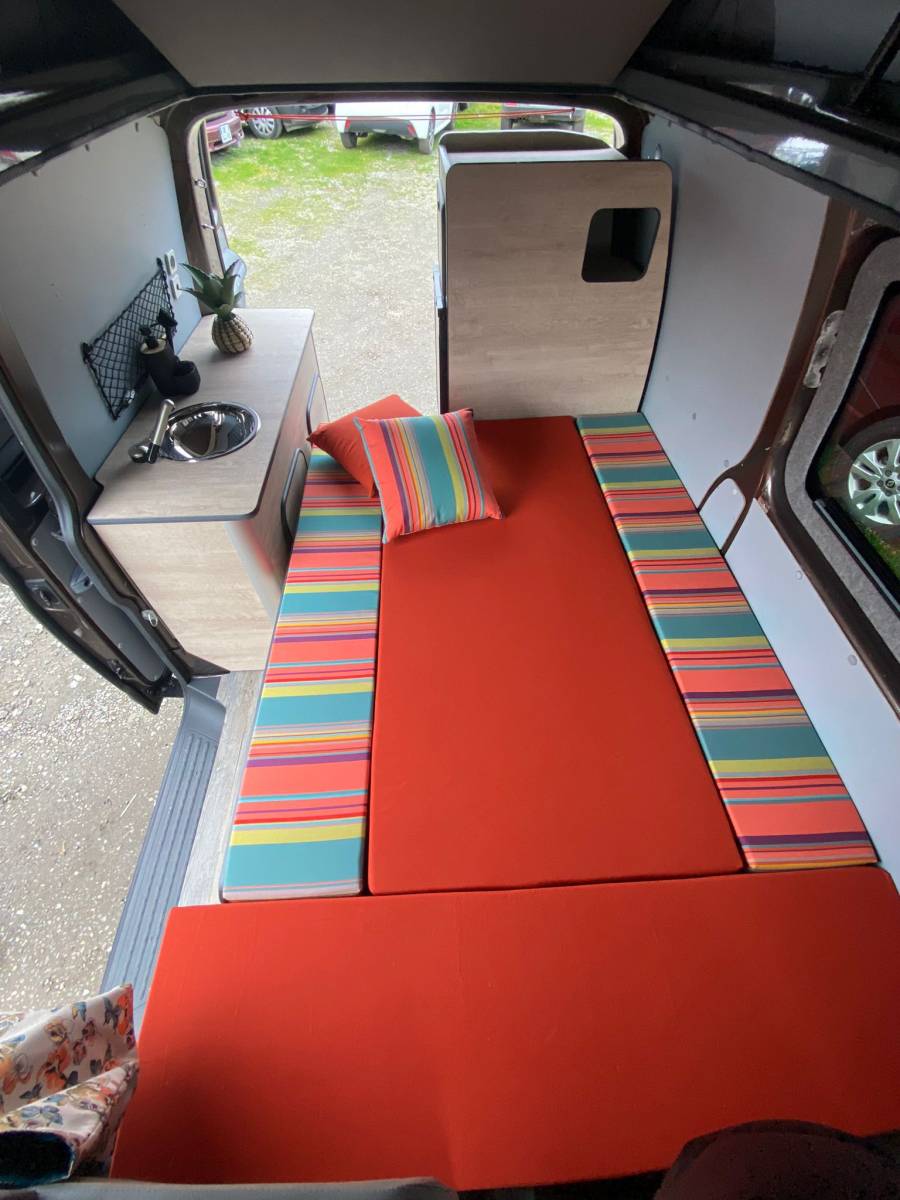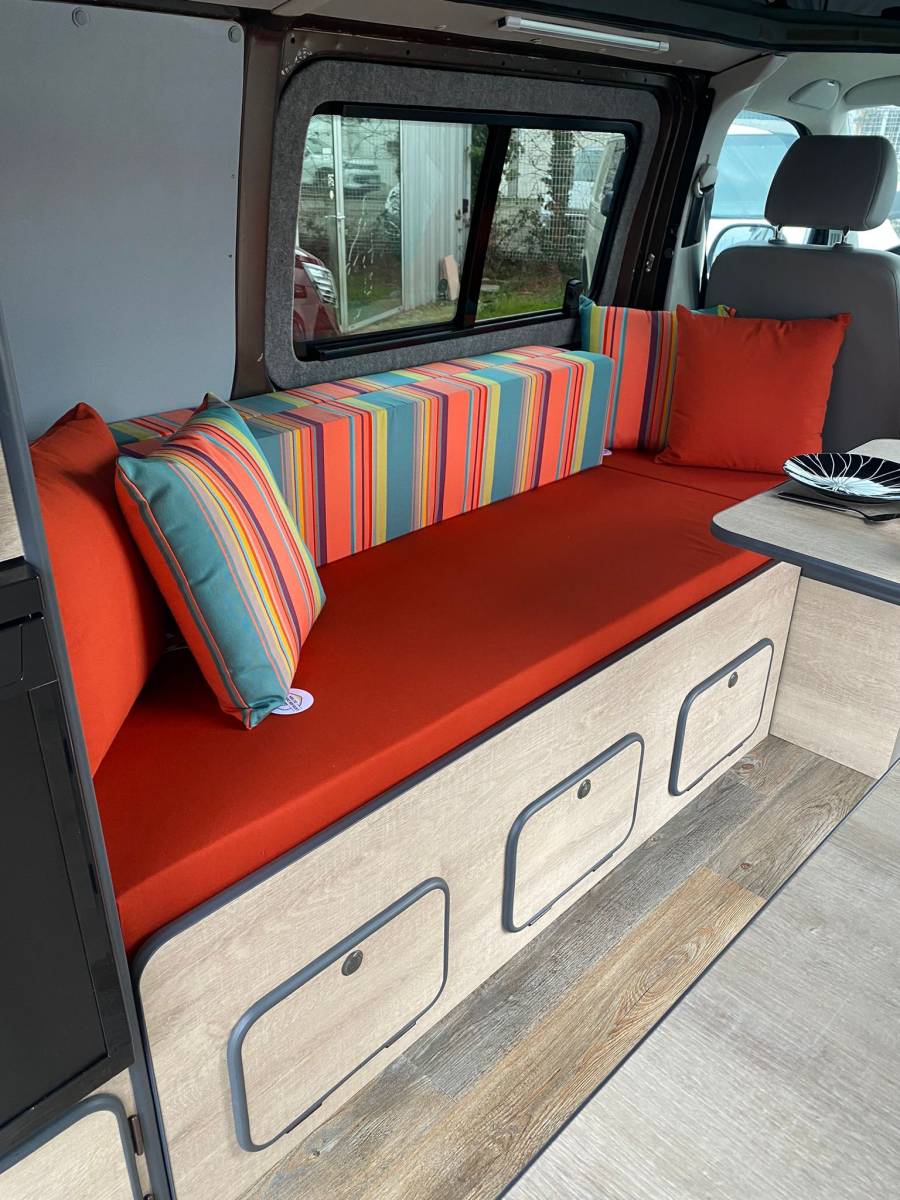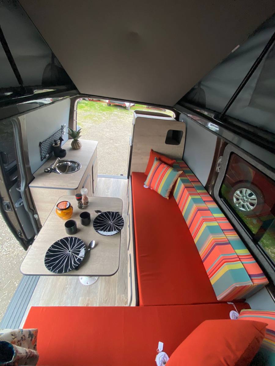 Ce van se distingue par ses coussins orange vif et ses rayures colorées, qui ajoutent une touche de joie à l’intérieur.