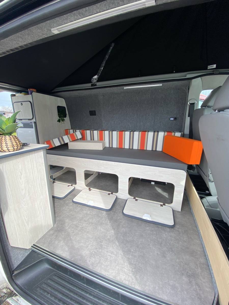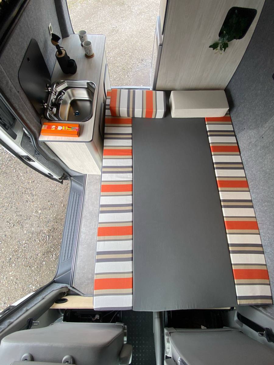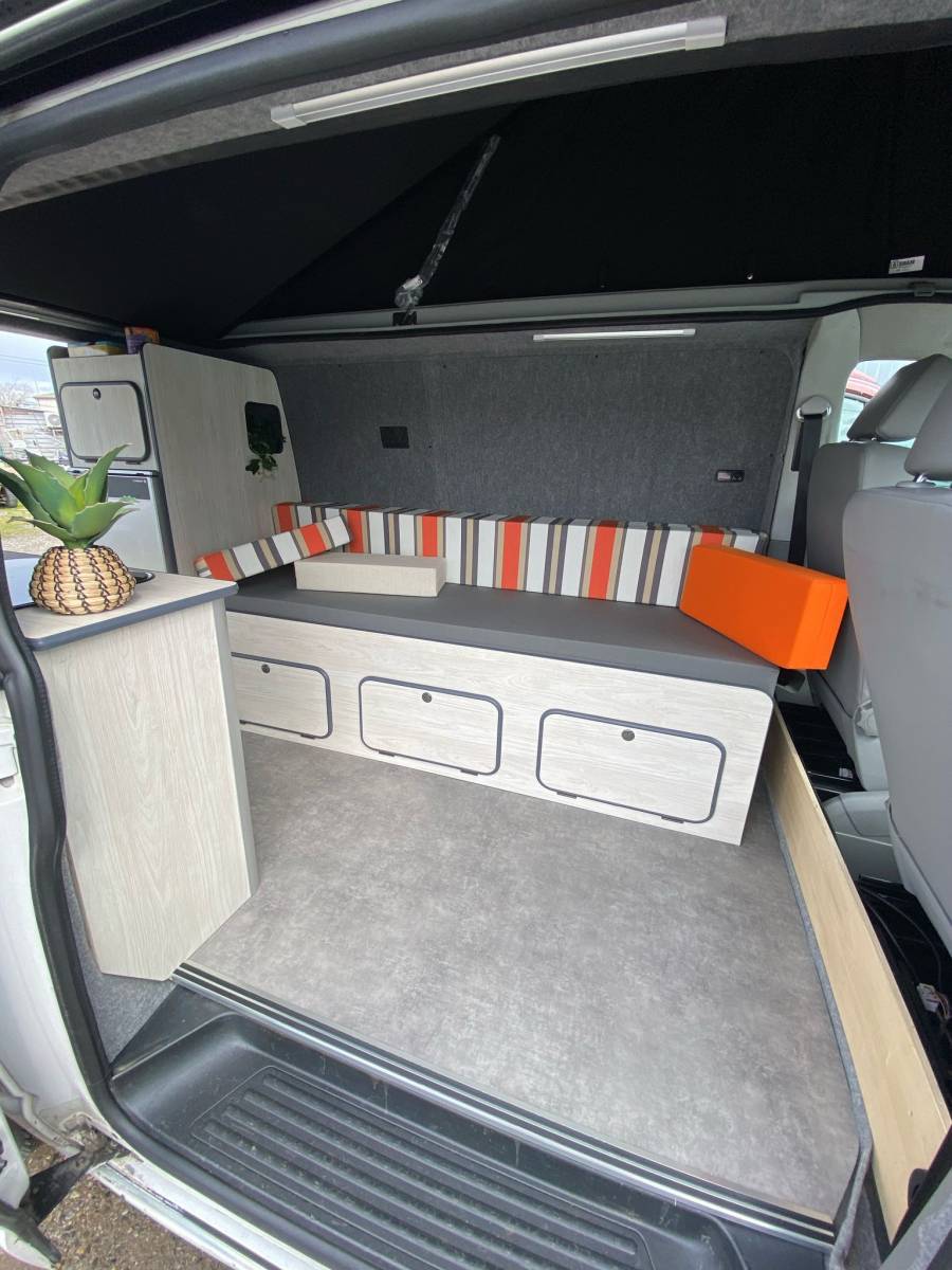 Ce van se distingue par ses coussins gris et orange à rayures, associés à un aménagement en bois clair qui crée une ambiance chaleureuse et moderne.