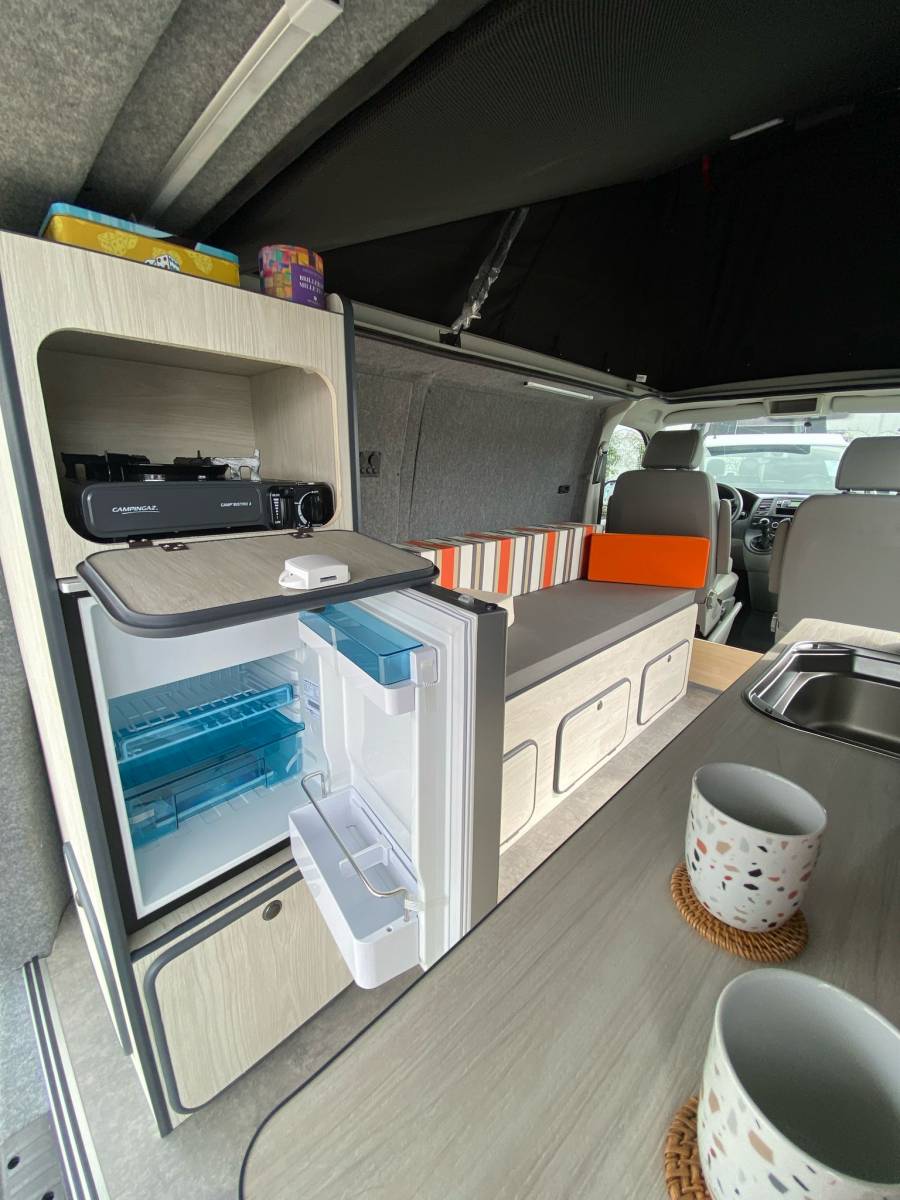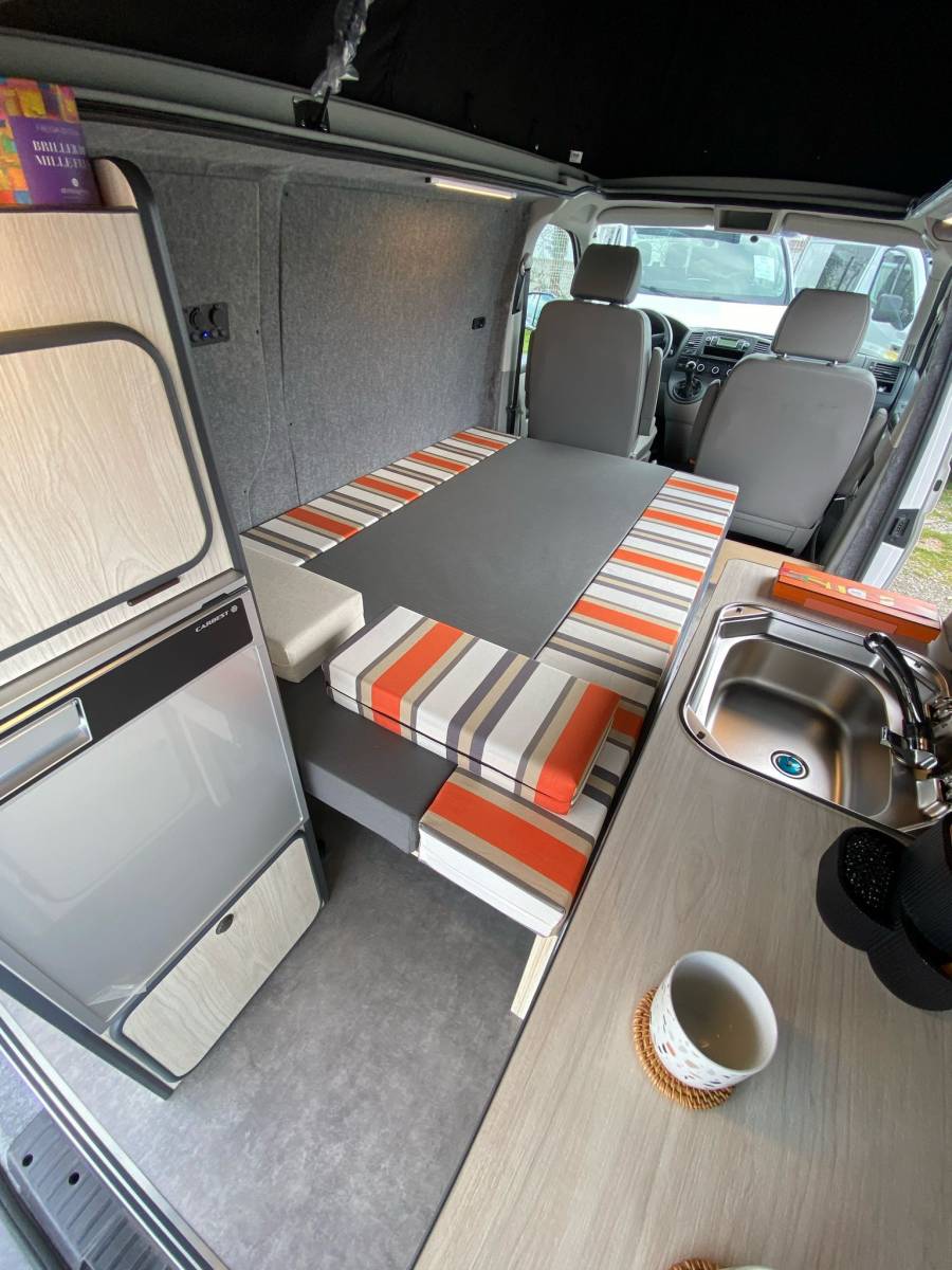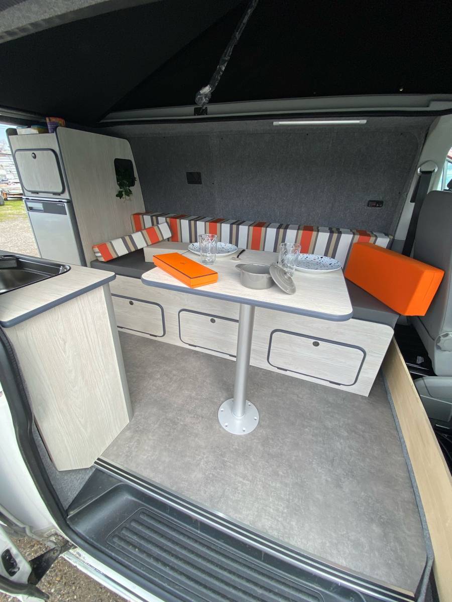 Ce van se distingue par ses coussins gris et orange à rayures, associés à un aménagement en bois clair qui crée une ambiance chaleureuse et moderne.