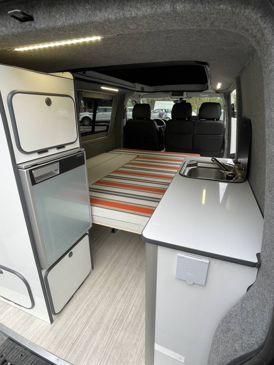 Vous bénéficiez d’un véhicule équipé de 4 couchages. 1 couchage 2 places sur la banquette qui ce transforme en lit en quelques seconde, ainsi que un second couchage 2 places dans le toit relevable avec éclairage intégré.