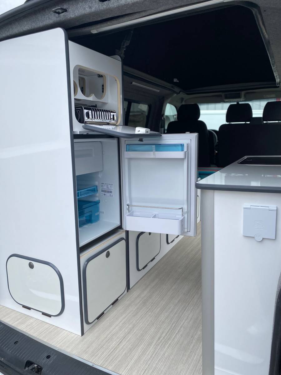 La penderie accueille un frigo à compression de 49L avec un compartiment freezer. Elle permet aussi le rangement d’un réchaud portatif qui a l’avantage de permettre de cuisiner dedans comme dehors ! La partie basse du meuble offre un grand rangement permettant aussi en option d’accueillir un WC portatif.