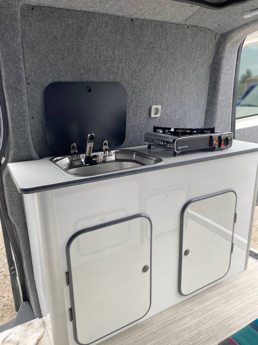 La cuisine équipée d’un coin d’eau avec réservoirs eaux propres et eaux usées, un réchaud au gaz pour cuisiner vos petit plats ainsi qu'une douchette extérieure sur l’arrière du véhicule.
