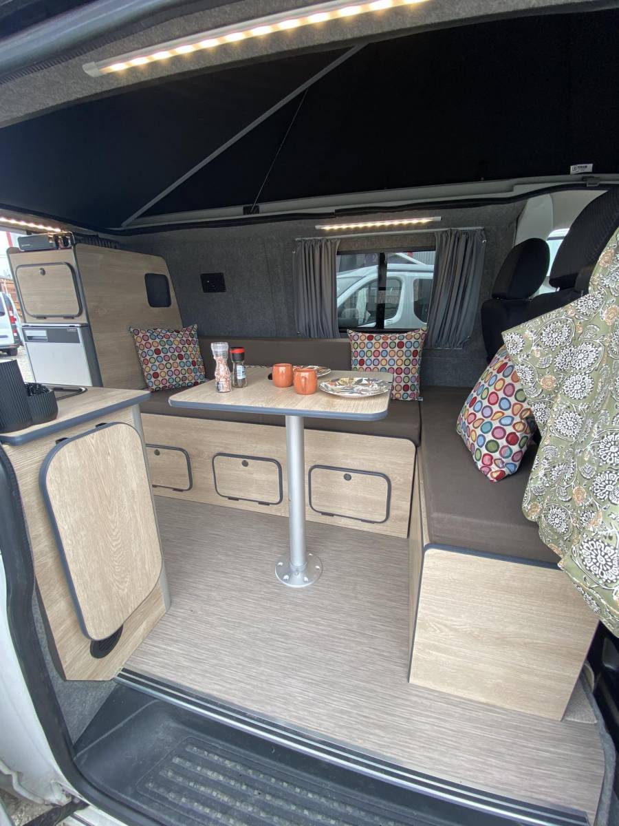 Vous bénéficiez d’un véhicule équipé de 4 couchages. 1 couchage 2 places sur la banquette qui ce transforme en lit en quelques seconde ainsi que d'un second couchage 2 places dans le toit relevable avec éclairage intégré.
