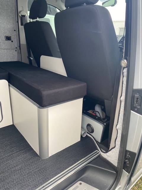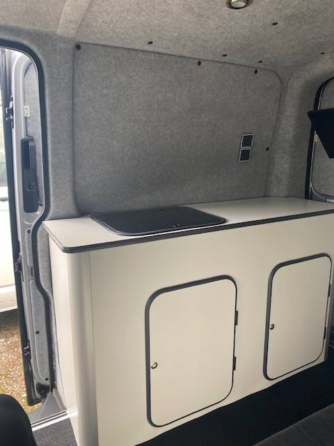 La cuisine équipée d’un coin d’eau avec réservoirs eaux propres et eaux usées de 20l chacun, un réchaud au gaz portatif pour cuisiner vos petit plats ainsi que d'une douchette extérieure sur l’arrière du véhicule.