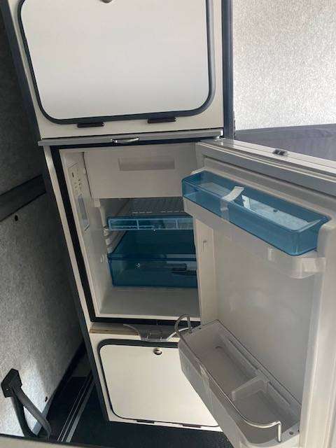 La penderie accueille un frigo à compression de 49L avec un compartiment freezer.