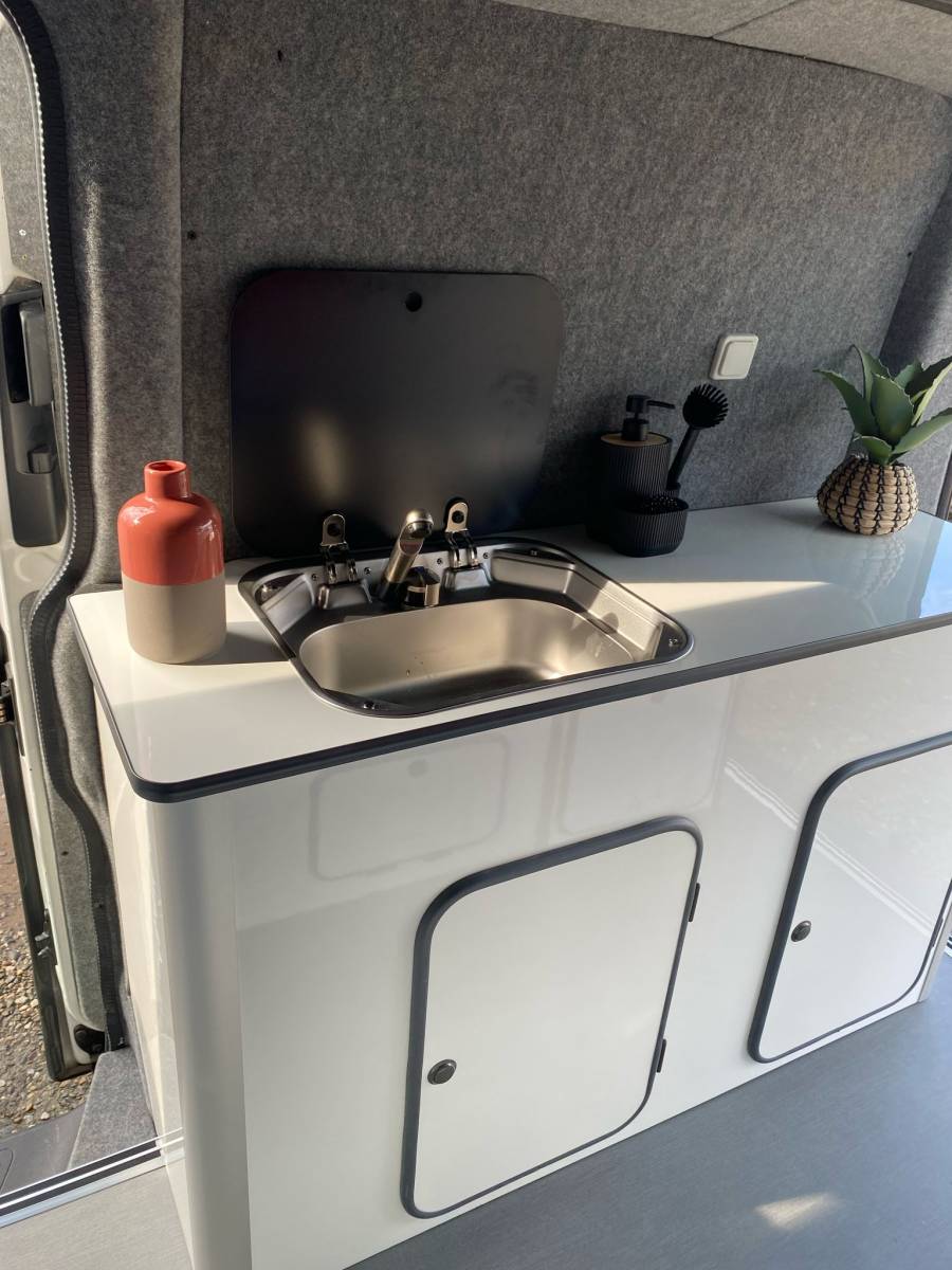 La cuisine équipée d’un coin d’eau avec réservoirs eaux propres et eaux usées, un réchaud au gaz pour cuisiner vos petit plats ainsi qu'une douchette extérieure sur l’arrière du véhicule. La penderie accueille un frigo à compression de 49L avec un compartiment freezer. Elle permet aussi le rangement d’un réchaud portatif qui a l’avantage de permettre de cuisiner dedans comme dehors ! La partie basse du meuble offre un grand rangement permettant aussi en option d’accueillir un WC portatif.